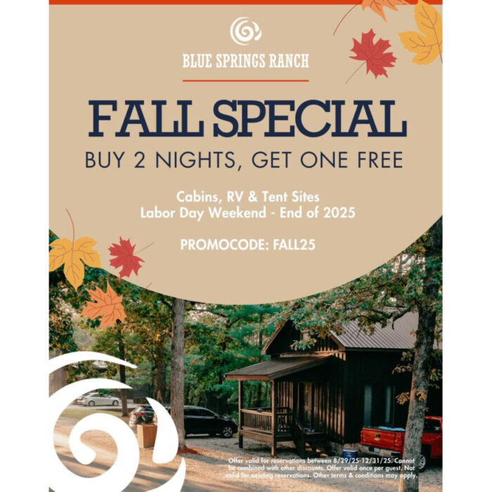 All the ways to save at Blue Springs Ranch! Check here and on our socials for all the special deals for your next getaway!